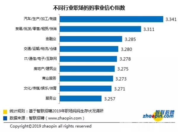 不同行业对职场妈妈体现出对事业信心的差别不大,从数值上看,汽车制造业及贸易批发行业的职场妈妈们对事业信心指数较高,服务业的职场妈妈事业信心最低,服务业普遍自由时间少且劳动强度大,工作中的心酸加上养娃的压力可能影响妈妈们的事业信心。