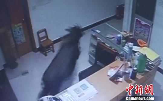中新网台州5月10日电 10日记者获悉,一头数百斤重的动物,近日凌晨出没于浙江省三门县新兴街一带。它先是闯进了一家药店,撞破了药店的玻璃柜台,又蹿入了旅馆,砸碎了旅馆的茶几,吓得店主心惊胆战,它的踪影正好被视频监控拍了下来。