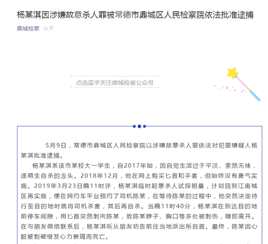 据“鼎城检察”微信公众号消息,5月9日,常德市鼎城区人民检察院以涉嫌故意杀人罪依法对犯罪嫌疑人杨某淇批准逮捕。