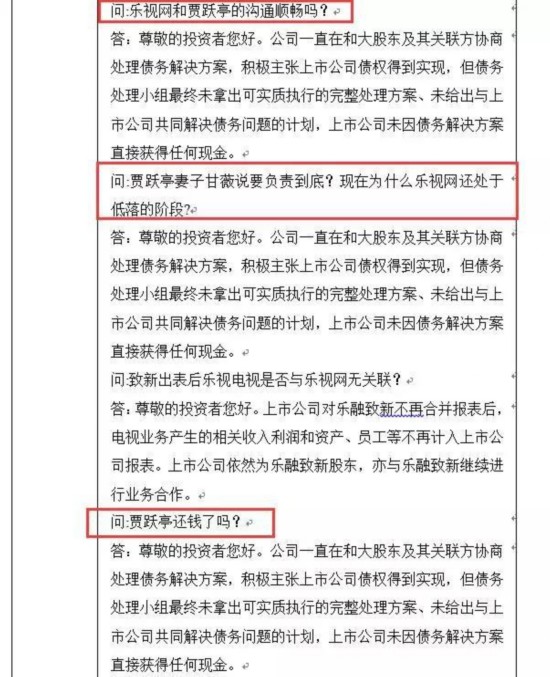 另外,在今天举行的投资者交流活动中,乐视网在回答公司与贾跃亭的沟通情况,以及提到贾跃亭妻子甘薇曾说要负责到底时,乐视网表示,债务处理小组最终未拿出可实质执行的完整处理方案、未给出与上市公司共同解决债务问题的计划,上市公司未因债务解决方案直接获得任何现金。