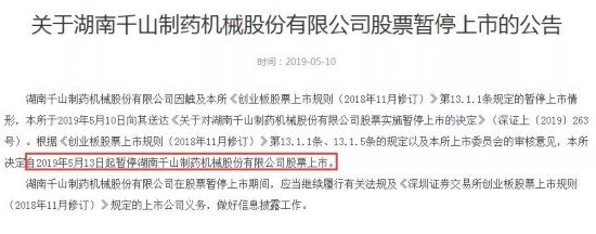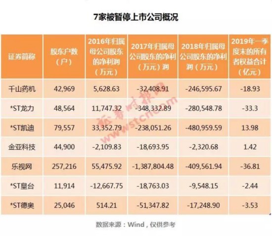 根据深交所的公告,乐视网、千山药机、*ST凯迪、*ST皇台、金亚科技等5家公司自2019年5月13日(即下周一)起即被暂停上市,*ST龙力、*ST德奥2家公司则是自2019年5月15日(即下周三)起被暂停上市。