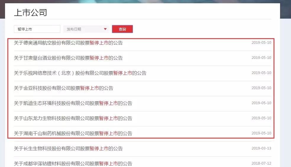 证券时报消息 5月10日晚间,深交所网站一次性发布了乐视网、千山药机、*ST龙力、*ST凯迪、金亚科技、*ST皇台、*ST德奥等7家公司的暂停上市公告,决定暂停上述公司股票上市。多达7家公司同一天被“宣判”暂停上市,可谓史无前例。如果相关上市公司其后未能消除导致暂停上市的因素,将直接面临强制退市风险。粗略估算,这7家公司股东户数合计超过50万,仅乐视网一家公司的股东户数就超过了25万。详情>>