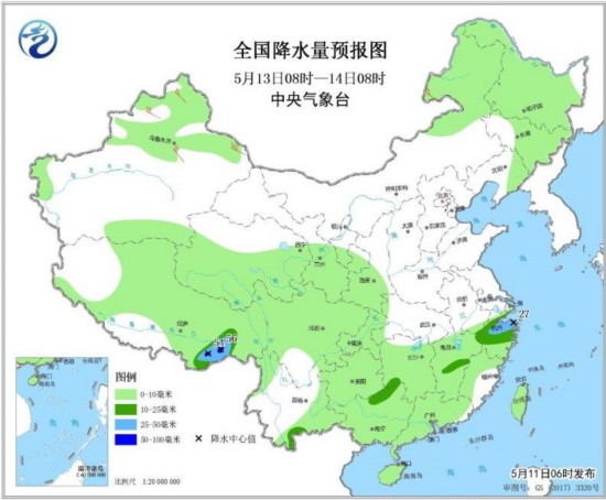图1 全国降水量预报图(5月11日08时-12日08时)
