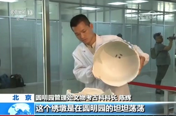 圆明园管理处文物考古科科长 陈辉:初期选择这6件是因为这6件有明确的出土地方。比如那两件青花的瓷砖,它是在思永斋这个地方出土的。然后还有一件是绣墩,这个是这次修复比较特色的一件了,它不是一般的日用器,像盘、碗这样的日用器,它是一种坐具,这个绣墩是在圆明园的坦坦荡荡,又俗称为金鱼池这个地方考古出土的,所以我们选择这6件,一个是器形相对来说比较完整,纹饰非常地精美,而且它出土地方比较明确。