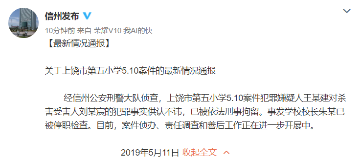 据信州发布官方微博,11日,关于上饶市第五小学5.10案件的最新情况通报发布。