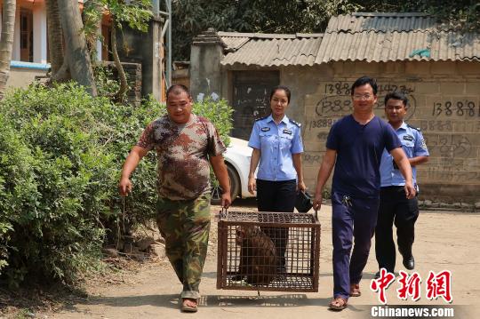 图为民警将红面猴移交野生动物保护站收容救助。常宗波 摄