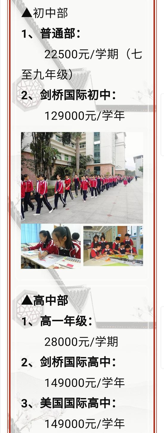具体来说,幼儿园学费每学期在1万元—2.5万元之间。小学部的普通班21000元/学期,国际课程实验班在35000元--45000元/学期。初中部的普通班为22500元/学期,剑桥国际初中则为129000元/学年。高中部的收费更加高昂,其中高一年级为28000元/学期,剑桥国际高中和美国国际高中的收费均为:149000元/学年。
