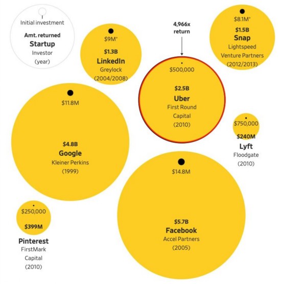 《华尔街日报》称,现在看来,即使是与谷歌、Facebook和本世纪初互联网热潮时的知名初创公司比,在2010年选择优步,也算得上有史以来最成功的风投之一。举例来讲: