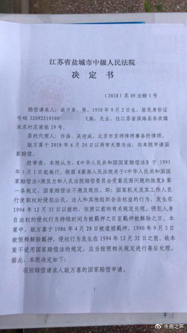 4月22日,媒体以“耿万喜涉诈骗获刑申诉32年改判无罪,申请国赔十个月无进展”为题报道了此事。本月6日,耿万喜接到盐城中院的通知,去领取不予国家赔偿的决定书。