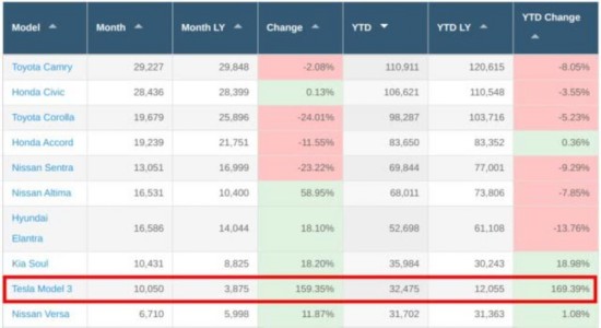 根据相关报告,特斯拉公司1月份仅售出6500辆Model 3,2月份售出5750辆,不过随着更加实惠的“标准+”版本推出,Model 3的销量在3月份飙升,一共销售了10175辆,较1月和2月的数据大幅增长,但还不足以跻身该销售跟踪网站的十大最畅销乘用车排行榜。