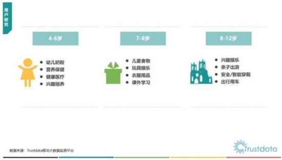 除教育外,在涉及到儿童消费方面,用户需求则更加多元化。如4-6岁孩子的用户家庭更注重奶粉、营养保健、医疗、兴趣培养,7-8岁孩子的用户家庭则关注食物、玩具娱乐、衣物、课外学习;8-12岁的用户家庭更为关注孩子的兴趣娱乐、家庭出游、安全智能穿戴及出行用车等。