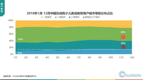 2018年,一、二线城市付费类用户占比达65%,是付费类少儿英语教育的主力军。从趋势上看,三四线城市用户比例持续上升。在线教育企业崛起于北上广深等一线城市,但下沉市场战略相较于一线城市的鏖战更具成长性。三四线城市及城镇的教育需求也呈现出进一步井喷的态势,而在线教育企业的崛起也因此成为弥合一线城市与三、四线城市教育资源差异的重要契机。