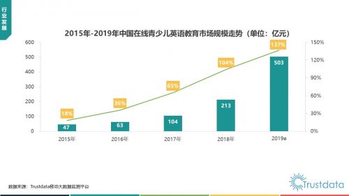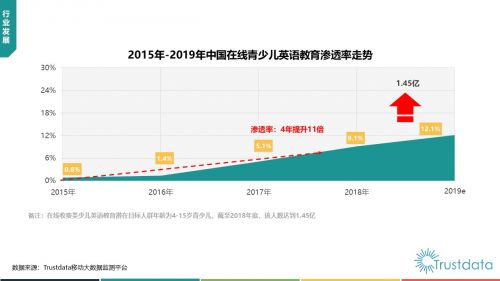 5月14日消息 国内知名移动互联网大数据监测平台Trustdata今日发布《2018年中国收费类在线青少儿英语教育市场研究报告》。报告显示,我国青少儿英语市场潜在需求人群超过1.4亿人,2018年在线青少儿英语付费用户增势迅猛,全年用户规模超1500万人,市场规模高达213亿元,预计这一规模在2019年将突破500亿元。