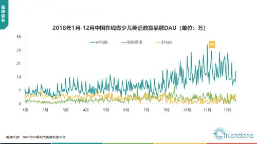 在2018年,VIPKID的日均活跃用户持续提升,其中11月峰值高达31万,创下在线青少儿英语教育平台的新记录。相比来看,其他平台则持续低位运行,51Talk则一路走低。