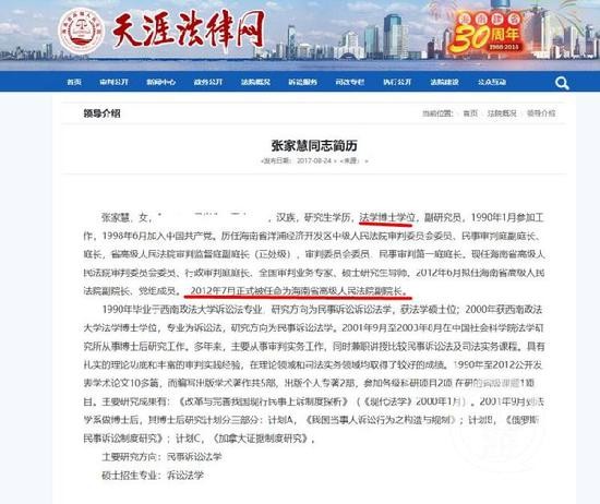 ▲海南省高院官网显示,张家慧系法学博士,2012年7月正式任命为海南省高级人民法院副院长。网页截图