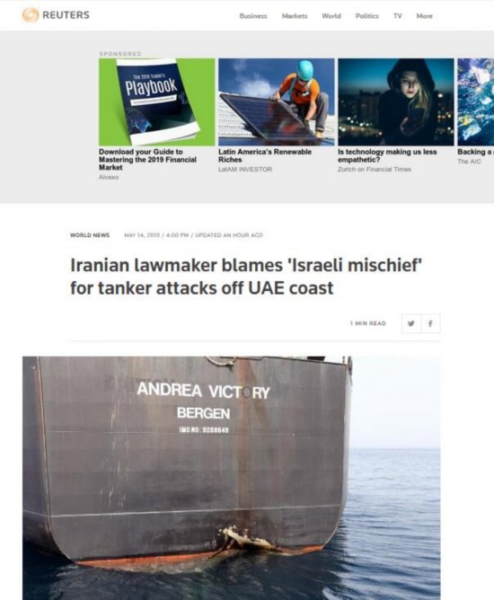 【环球网报道 实习记者 李东尧】路透社14日援引伊朗伊斯兰共和国通讯社(IRNA)消息说,伊朗议会发言人贝赫鲁兹·内马蒂(Behrouz Nemati)14日表示,阿联酋海岸发生的“油轮遇袭”事件是“以色列的恶作剧”。不过,他并未提供以色列在事件中所扮演角色的有关细节。