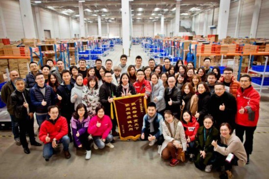 (2018年双11宝洁给菜鸟供应链团队送锦旗,中间为宝洁大中华区电商总裁许敏)