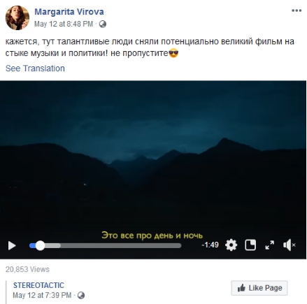 不难看出,维洛娃十分热爱她的工作,对生活充满了热情,而这位优秀的姑娘却因自己一瞬间的疏忽,结束了本该灿烂绽放的生命。维洛娃的最后一条脸书定格在5月12日20:48分,她这样写道:“才华横溢的人们拍摄了一部很棒的电影,融合了音乐与政治元素!不要错过”。