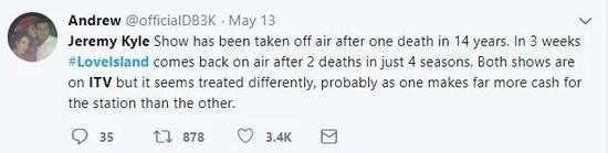 所以,除了有不少英国网民在要求英国独立电视台把“恋爱岛”也一起停播外,更有一些“杰瑞米·凯尔秀”的粉丝在斥责电视台太虚伪:为啥把一个播14年才死了一个人的节目立刻停播,却对于另一个4年就已经死了2个人的节目选择性失明?