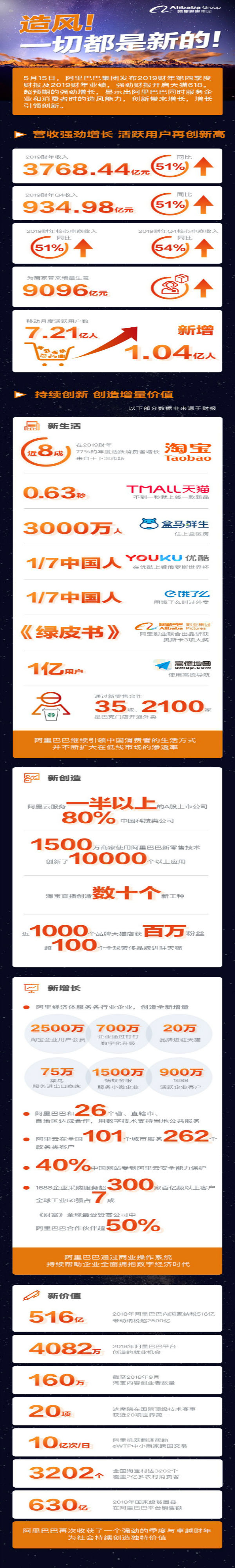 荔枝新闻讯 北京时间5月15日,阿里巴巴集团发布2019财年第四季度财报及2019财年业绩,强劲开启天猫618。本财年,阿里巴巴集团收入达3768.44亿元,第四季度收入达934.98亿元人民币,同比增长均达到51%。淘宝天猫过去一财年新增超1亿用户,为品牌和商家带来超过9000亿增量生意。