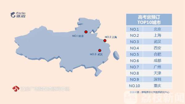 数据显示,北京、上海、武汉、西安、合肥、成都、广州、天津、深圳、重庆成为了高考房预订量最高的十个城市。除此之外,郑州、济南、南京、大连、沈阳的酒店预订量也排在前列,二三线城市的考生成为高考房预订的主力军。