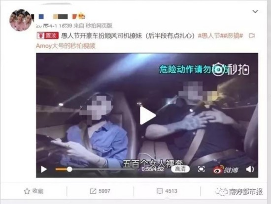 记者注意到,部分视频中车主存在危险动作。如在2018年4月1日发布的一则名为“愚人节开豪车扮顺风车司机撩妹”的视频中,视频时长近5分钟,大部分时间内司机仅单手握方向盘,部分片段中甚至双手撒开。视频中,右上角则打出了“危险动作请勿模仿”的字样。