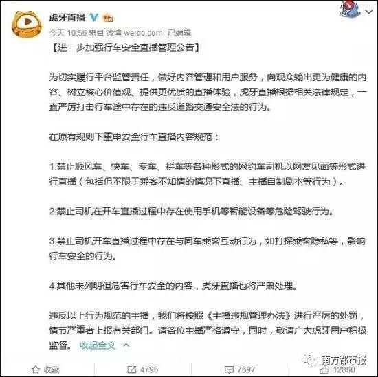 2018年8月29日,虎牙直播发布《进一步加强行车安全直播内容管理公告》,禁止顺风车、快车、专车、拼车等各种形式的网约车司机以网友见面等形式进行直播(包括但不限于乘客不知情的情况下直播、主播自制剧本等行为)。