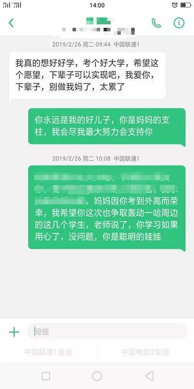 10点08分唐咏枝又发了一条短信,“妈妈因你考到外高而为荣幸,我希望你这次也争取轰动一哈周边的几个学生,老师说了,你学习如果用心了,没问题,你是聪明的娃娃。”