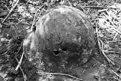 第二个证据是5月7日,在距离发现身份牌的地方不到2米,杨国庆清理出头骨的同时找到一顶钢盔。钢盔左前方有两个小窟窿、右前方窟窿稍大。杨国庆判断,有两颗子弹从钢盔左前方射入、右前方射出,钢盔被完全打穿。他还发现,这顶钢盔顶端有4个微小的气孔,与日军钢盔特征相符。