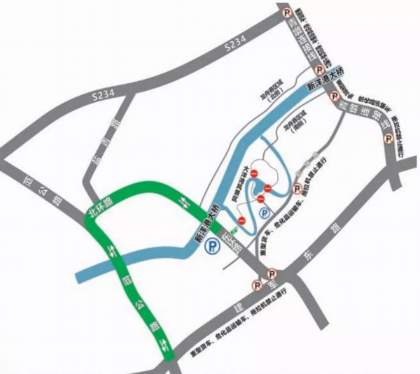 严禁除比赛工作用车、 电视台设备车辆外的其他车辆进入新洋港北侧道路, 除持通行证的游客大客车、 应急车辆外的其他车辆,严禁进入新洋港南侧辅道。严禁重型货车、 危化品运输车驶入东环路 (范公路至建军东路)段、机场路(建军东路以北)段、青墩连接线(234省道至建军东路)段通行。