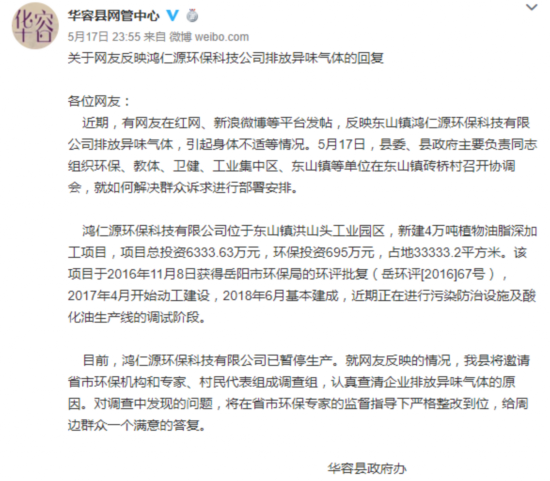 5月17日夜间,湖南省华容县互联网新闻宣传管理中心官方微博发布关于网友反映鸿仁源环保科技公司排放异味气体的回复: