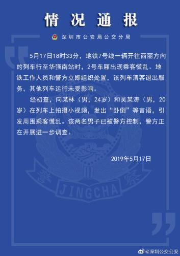 荔枝新闻讯 据深圳市公安局公交分局微博消息,5月17日18时33分,深圳地铁7号线一辆开往西丽方向的列车行至华强南站时,2号车厢出现乘客慌乱。地铁工作人员和警方立即组织处置,该列车清客退出服务,其他列车运行未受影响。