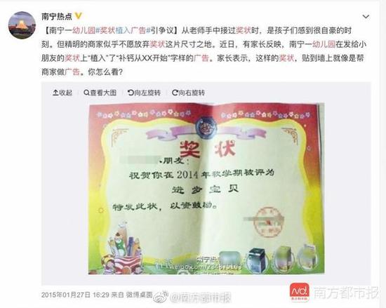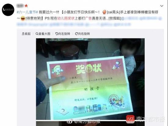 南都记者搜索发现,该企业在奖状上印广告已非首次。2012年、2014年、2018年,都有家长在微博晒出印有该品牌广告的奖状,并提出质疑。其中,广西南宁一幼儿园2014年颁发的奖状与此次引发争议的奖状广告内容一模一样。5月17日,南都记者多次拨打该企业客服热线,并向官微发私信询问此事,截至发稿均未获得回复。