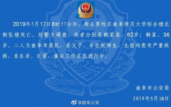 荔枝新闻讯 据@曲阜公安5月18日通报:2019年5月17日8时57分许,两名男性在曲阜师范大学综合楼北侧坠楼死亡。经警方调查:死者分别是韩某某,62岁;韩某,36岁。二人为曲阜市居民,系父子,非在校师生,生前均患有严重疾病,系自杀。目前,善后工作正在进行中。
