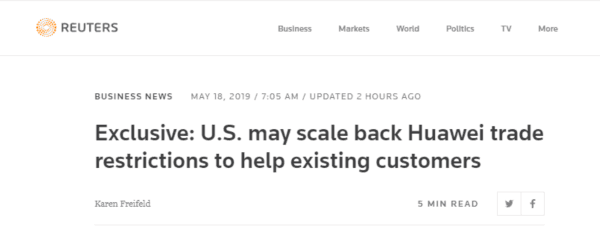 【环球网报道】据路透社报道,美国商务部17日表示,可能会很快缩减对华为技术的限制,正在考虑为华为提供一张为期90天的“临时通用执照”。报道称,此举意味着美国商务部将允许华为购买美国商品,为现有客户继续提供服务。15日,美国总统签署行政令,禁止美国公司使用由那些对国家安全构成风险的公司制造的通讯设备。与此同时,美国商务部工业与安全局(BIS)宣布将华为列入所谓“实体清单”,要求任何向华为出售产品的美国公司必须获得许可特批。