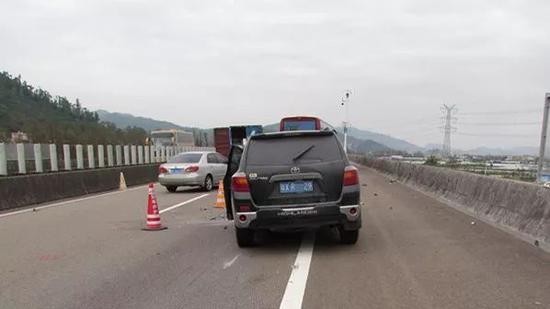 一名丰田小车司机说,当时看到一辆蓝色货车斜停在路边,车头停在应急车道内,尾部突出了80公分左右,压着行车道,一名男子站在车后在打电话。