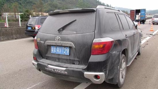 前方20米处,汉兰达SUV压住实线停在应急车道边上,车头撞烂,引擎盖被掀起,挡风玻璃破裂,右侧倒后镜不翼而飞。▼