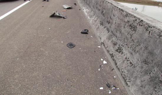 现场散落着一双黑色运动鞋、一部摔烂的手机、一把车钥匙和一块撞烂的警示三角标志牌。▼