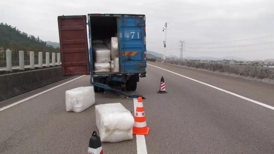再往前20多米,有一辆粤BU××71号轻型厢式货车停在最左侧车道上,尾部防撞杆脱落,车厢门半开着,货物掉在路面。▼