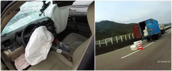汉兰达车内安全气囊全部弹出,而蓝色货车被撞后向前冲去,在前方最左侧车道停了下来。▼