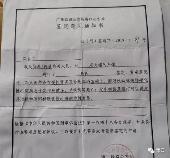 广州铁路公安局海口公安处的刑事鉴定意见通知书显示,经过尸检,“邓大楣符合在慢性肾炎及肾衰竭的基础上,因冠状动脉粥样硬化性心脏病急性发作致循环、呼吸衰竭死亡;发生纠纷及殴打可以诱发其冠状动脉粥样硬化性心脏病急性发作。”