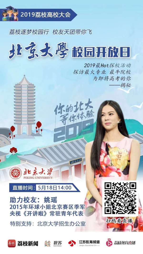 5月18日是北京大学校园开放日,江苏教育频道主持人潘牧雨和特邀校友姚瑶一起,带你逛北大。姚瑶是标准的“三高”人士:学历高、身高高、颜值高,她高中就读于苏州中学,本科考入浙江大学,北京大学硕士毕业。她还是2015年环球小姐北京赛区季军,央视《开讲啦》常驻青年代表。