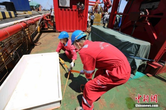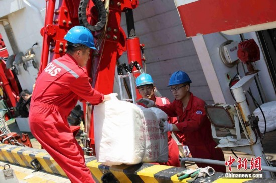 图为科考队员将科考用品搬运上“科学”号。 中新社记者 胡耀杰 摄