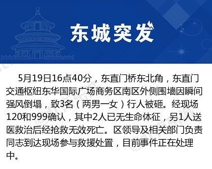据北京市东城区官方微博消息,5月19日16点40分,东直门桥东北角,东直门交通枢纽东华国际广场商务区南区外侧围墙因瞬间强风倒塌,致3名(两男一女)行人被砸。经现场120和999确认,其中2人已无生命体征,另1人送医救治后经抢救无效死亡。》》详情