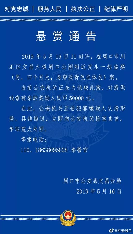 周口警方再发悬赏通告,将此事确定为盗婴案,并悬赏5万元查找线索。