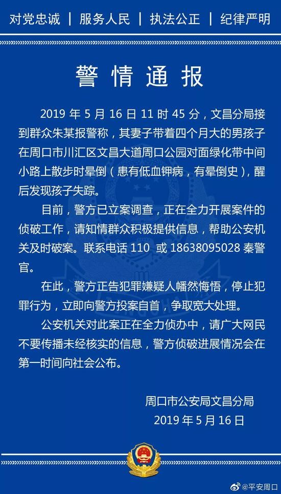 5月19日凌晨,嫌疑人及丢失男婴被周口警方带走。情况通报表示,婴儿已从郑州安全找回,身体状况正常。