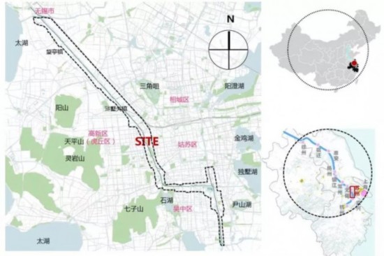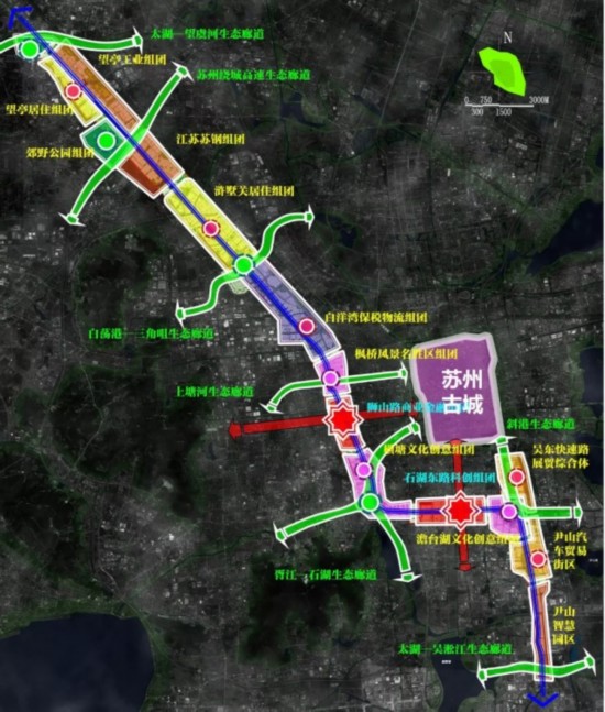 北起相城区望虞河,南至吴中区吴淞江,东至宝带桥约40公里沿岸地区,涵盖相城、高新、姑苏、吴中四区,占地面积48平方公里。