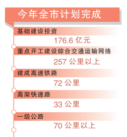 突出重点项目建设,加快构筑现代综合交通运输体系。今年年初,全市敲定交通建设“大盘”:计划完成基础建设投资176.6亿元,重点开工建设综合交通运输网络257公里以上,建成高速铁路72公里、高架快速路33公里、一级公路70公里以上。