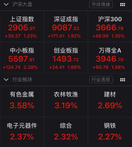 5月21日,A股三大股指全线收涨,稀土永磁概念股再掀涨停潮,板块均涨幅逾7%,并带领有色金属、煤炭等资源类股领涨两市,最终沪指收涨1.23%重返2900点关口。截至收盘,沪指收报2905.97点,涨幅1.23%;深成指收报9087.52点,涨幅1.92%;创业板指收报1493.72点,涨幅1.66%。