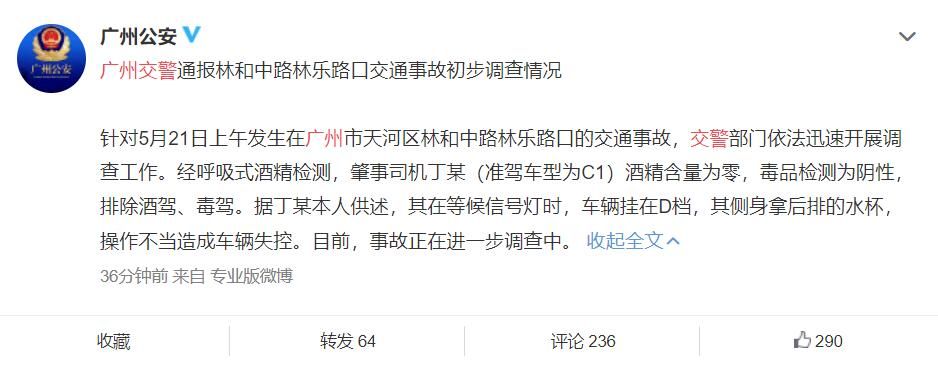 针对5月21日上午发生在广州市天河区林和中路林乐路口的交通事故,交警部门依法迅速开展调查工作。经呼吸式酒精检测,肇事司机丁某(准驾车型为C1)酒精含量为零,毒品检测为阴性,排除酒驾、毒驾。据丁某本人供述,其在等候信号灯时,车辆挂在D档,其侧身拿后排的水杯,操作不当造成车辆失控。目前,事故正在进一步调查中。